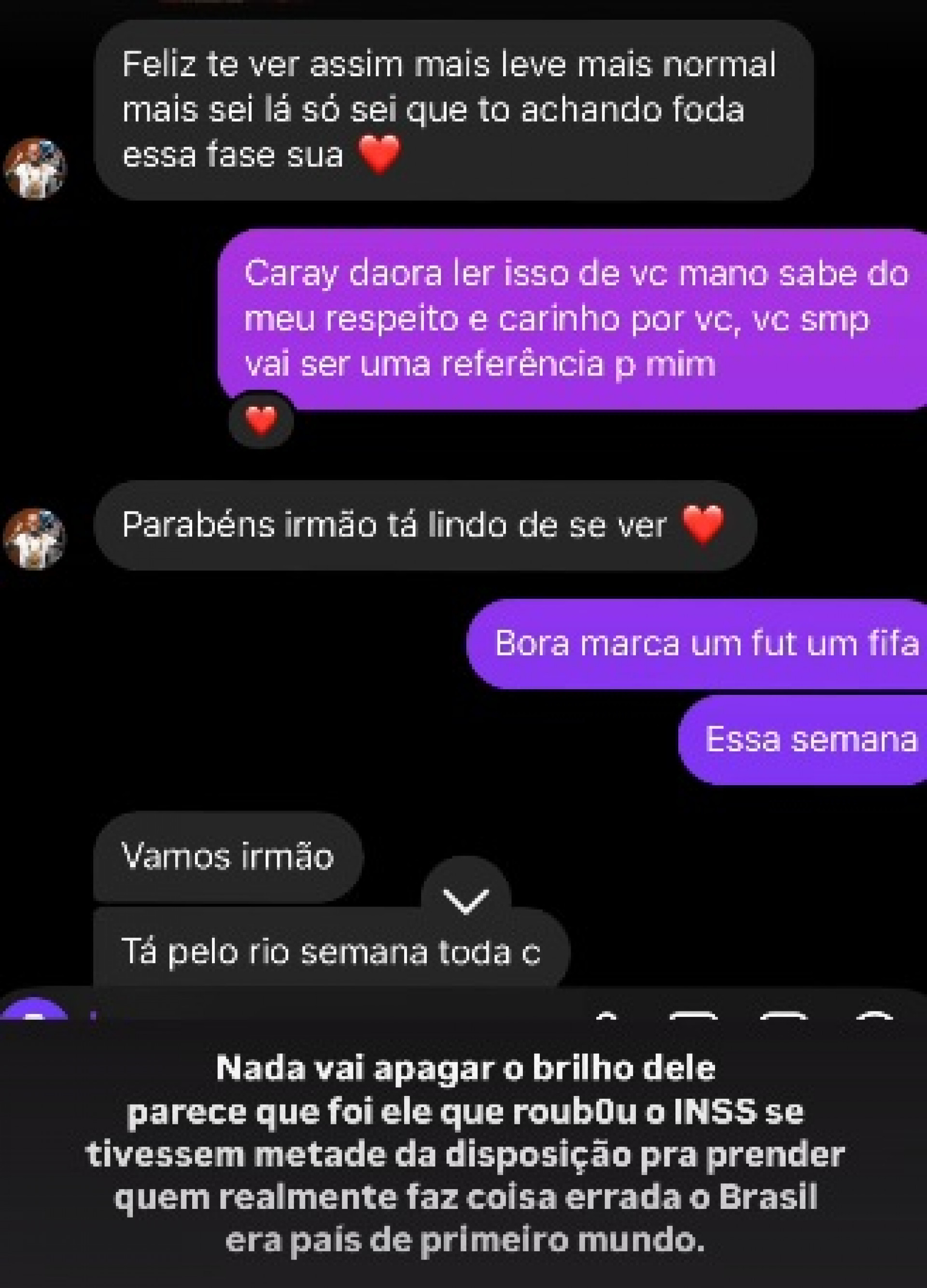 Daniel Amorim Nicola, MC Daniel, também se pronunciou por meio das redes sociais. Em sua declaração, o cantor escreveu que “parece que foi ele que roubou o INSS”, referindo-se à farra do Instituto Nacional do Seguro Social (INSS). “Nada vai apagar o brilho dele. Parece que foi ele que roubou o INSS. Se tivessem metade da disposição para prender quem realmente faz coisa errada, o Brasil era país de primeiro mundo”, opinou.