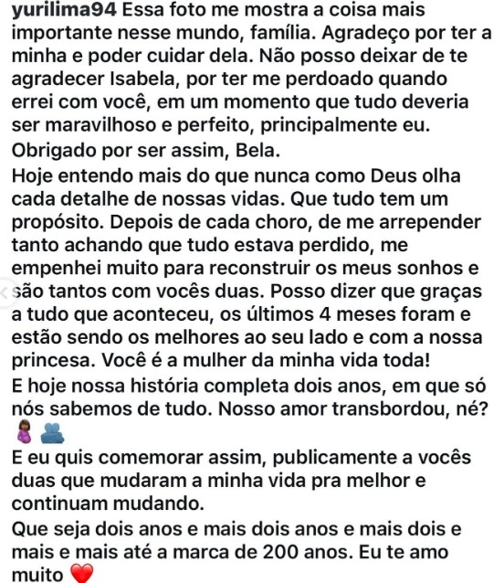 Em julho de 2024, Iza confirmou publicamente que havia descoberto mensagens comprometedoras de Yuri com outra mulher, o que levou ao fim da relação. Mesmo abalada, ela afirmou que não pretendia se pronunciar mais sobre o assunto. Meses depois, o casal aparentemente voltou a se aproximar. No Dia de Ano-Novo de 2025, Yuri publicou uma homenagem a Iza no Instagram, celebrando dois anos de relacionamento e agradecendo pelo perdão: “Essa foto me mostra a coisa mais importante do mundo: família. Agradeço por ter a minha e por poder cuidar dela. Obrigado, Isabela, por ter me perdoado quando errei com você.”